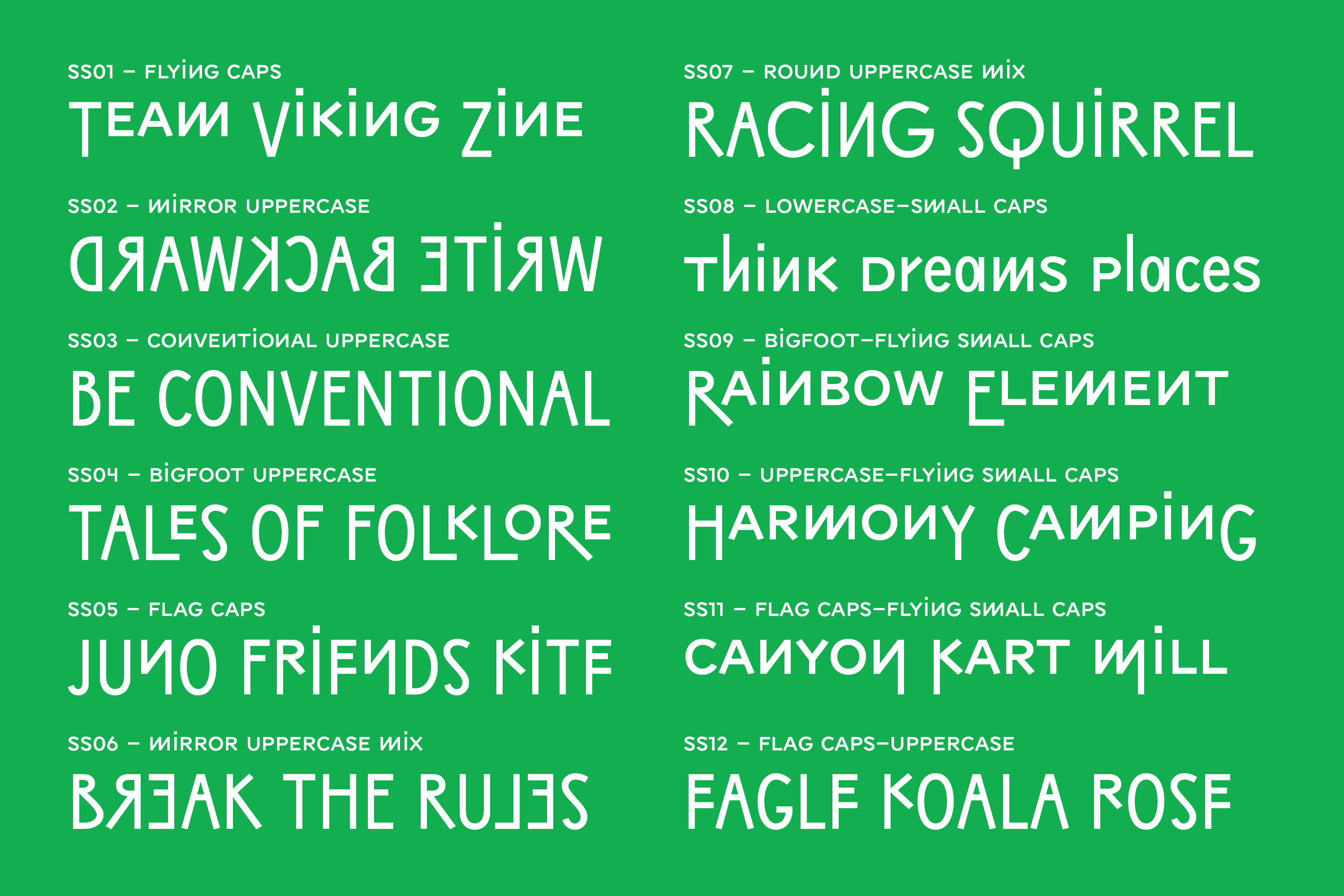 We have made these ideas into a variable font that changes features from Narrow to Wide, affecting not only the width but also the skeleton of the letters. Sixten includes conventional and expressive alternates that provide numerous ways of rebelling against the expected. Small Caps don’t follow conventional patterns, they use the same height as lowercase (petite caps) and their width is consistent across the width axis. The 12 stylistic sets include dynamic text combinations that mix mirror writing, flying small caps, flag caps and many more.